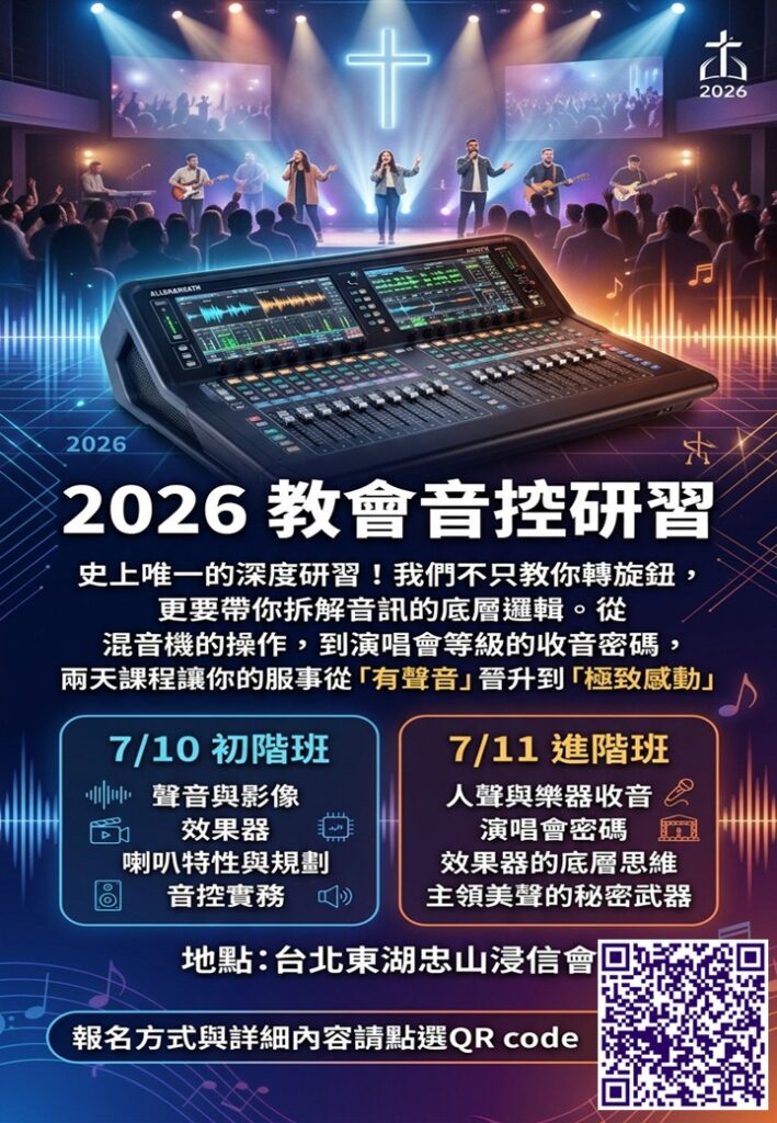 2026教會音控訓練 發佈日期: 30 1 月, 202631 3 月, 2026 作者: Xie Xiangyong 音控教育的回顧與創新 2023年開始,邀請了學園傳道會蔡嘉揚牧師領導的「音為愛音樂事奉團隊」參與音控訓練。從歌曲挑選、程序討論、曲風選擇、音樂詮釋、器樂平衡、音色調整、效果器調整、到最後的混音輸出、、、透過真實敬拜樂團的示範展演,實際演練如何預備以及跟敬拜團溝通,做好音控的服事。總計2023台北二場、2024高雄二場、2025台中一場。我們得到非常好的回應:教會就是需要這樣的學習方式。但不可否認的,這是屬於比較進階的課程,三年過去了,邁入2026年的第四年,還是要回歸教會的需求。教會每隔幾年就會有一輪新進服事同工投入音控的行列,即便是已經有經驗的音控人員,也是有基礎訓練學習的需求。 今年2026年會在台北舉行,總計兩天的課程。 第一天是基礎課程包含聽力訓練,認識各樣線材以及接頭、音樂曲風與混音。認識各種喇叭的特性與應用,認識各類線材、接頭並知道如何正確使用。導播直播的介紹。混音機與效果器的介紹與應用,以及音控實務。 第二天是進階課程進階課程將邀請蔡嘉揚牧師的音樂團隊來進行示範。也會介紹近年來在流行音樂界,甚至於在教會,大量使用的PGM概念、製作、應用,讓音控人員可以跟敬拜團接軌。介紹基本的DAW錄音編曲、虛擬人聲製作、修音調音軟體的概念。音控人員稍微了解這個部分,比較容易跟敬拜團、主領、音樂總監溝通。我們堅信,良好的溝通與音樂鑑賞素養,是音控人員必須具備的能力。 相信今年的課程,可以滿足絕大多數教會在音控訓練學習上的需求,無論您是剛加入音樂事工的服事,或是已經很有經驗了,都可以在這樣子的學習過程當中得著幫助。 7/10 第一天9:00-17:00一、音控概念1、神學基礎:教會音控的目的、音控的服事對象、以誰為主?2、視角與專業能力3、具備條件:EQ、音樂審美、溝通協調 二、基礎聲學1、聲音的物理特性2、喇叭規劃:House主喇叭、補音輔助喇叭、Monitor監聽喇叭、重低音喇叭的聲學特性與調整3、喇叭特性:點音源、線陣列4、FIR、Endfire 、Cardioid介紹。 三、聲音與影像1、音響與影像的線材與接頭:品牌、規格、使用2、攝影機、導播機、硬體軟體直播、調整、LED Wall 四、聽力訓練 五、音樂曲風介紹 六、混音機與效果器 七、音控實務:1、如何準備2、如何混音 八、Q&A 7/11第二天9:00-17:00一、人聲與樂器收音:1、麥克風收音:原則、人聲收音、詩班收音、樂器收音2、樂器收音DI、介紹與評比、3、監聽系統:監聽喇叭、數位監聽、耳內監聽 二、混音原則1、平衡2、專輯錄音 vs. Live:認知與期待 三、演唱會密碼:DAW、PGM(Rough Mix)、Q Lab、Melodyne、Synthesizer v 介紹 四、系統增益架構:Meter表頭判讀、從混音機的Gain到擴大機的Gain、現場與直播音量調整 五、樂團溝通: 六、音控實務:Miking、Tuning、(Tracking) 、Mixing、(Mastering) 七、混音實務:1、效果器的底層思維2:主領美聲的秘密武器 八、Q&A 點我報名 2025台中 2024高雄 2023台北 2022高雄 2022台中 2022台北 DI-Box比較 2022台北